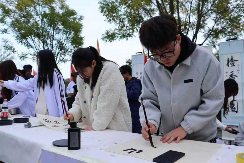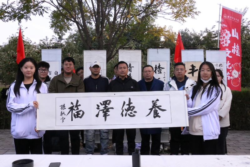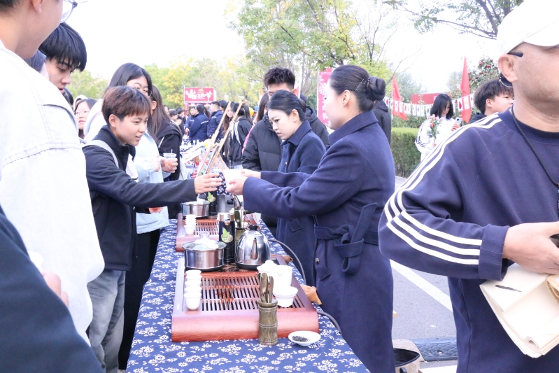 文学院打造的“书法+茶艺”主题展区尤为引人注目。在庞占川、杨新宇两位老师的指导下,学生们围绕“山楂”主题现场挥毫,作品内容既涵盖歌颂秋实与丰收的经典诗篇,也融入了富有时代气息的劳动口号,笔墨之间尽显才情与功力。与此同时,空中乘务专业学生带来的茶艺表演,动作优雅流畅,仪态从容大方。一动一静,相映成趣:书法区凝练秋日诗意,茶艺区则奉上融融暖意,共同构成了文化节上一道韵味独特的风景线。